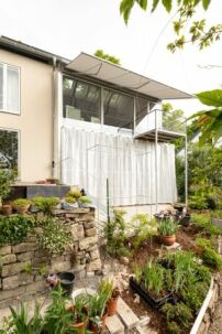 Und an heißen Sommertagen? Da zieht man die außenliegenden Vorhänge zu, die eigentlich aus dem Gewächshausbau stammen. Sie bestehen aus einem Gewebe, in das Alustreifen eingearbeitet sind. So reflektieren sie das Sonnenlicht und bleiben dennoch transluzent. Der Raum hat Werkstattcharakter. Dafür sorgt unter anderem das hangseitige Halbgeschoss, unter dem sich reichlich Stauraum bietet. Für die Bauherr*innen sei dieser Gartensaal zum Alleskönner im Alltag geworden. Hier werde durchaus gebacken oder der morgendliche Kaffee getrunken, unabhängig von der Jahreszeit. Künftig soll noch eine Sauna eingebaut werden. Die Architekt*innen sprechen von einem Bindeglied, denn der Raum schließt an die Terrasse als auch an den Keller und die Küche im Erdgeschoss des Bestands an.