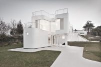 Die Architekten wollten sich nicht der Form des Bestands anpassen, sondern erkennbar einen visionären Neubau schaffen. Fließende Formen, weiße Fassaden und schlanke, schräge Stützen prägen das Bild der Anbauten, die sich als Wohnskulptur-Ensemble mit dem Altbau und der Landschaft verbinden. Damit orientieren sich Dosis an der Architektursprache von Zaha Hadid, UN Studio oder J. Mayer H. – letzterer hatte zum Beispiel bei seinem neuen Wohnhaus bei Stuttgart oder bei der Villa „Dupli.Casa“ in Ludwigsburg fließende Übergänge von Fassaden und Außenraum inszeniert.
