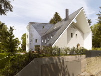 Die Bauherrenfamilie hatte zwei Wünsche: Der Eingangsbereich ihres Hauses sollte klar definiert und die Wohnfläche zur straßenabgewandten Seite nach Norden um ein Wohn-, ein Schlaf-, ein Badezimmer sowie Fitnessräume erweitert werden. Um zugleich geschützte Außenbereiche herzustellen, stülpten sie über das bestehende Walmdachhaus eine Hülle. Diese steht an beiden Seiten über und schafft die gewünschten Räume: Es ist ein für die Architekten typisches Wechselspiel aus Innen-, Außen- und Übergangsräumen entstanden. Der Abstand der Hülle zum Altbau ist je nach Nutzung unterschiedlich.