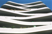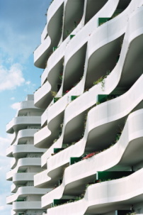 Nicht nur eine Kostenminimierung war das Ziel, sondern auch eine Maximierung des Sonnenlichteinfalls in die Wohnräume. Dazu haben die Architekten die Geometrie herangezogen: Die Balkone bilden im Grundriss eine permanent vor- und zurückschwingende Sinuskurve, die ihre Amplitude immer genau vor den Wohnzimmern hat: Hier kragt der Balkon bis zu 3,20 Meter weit aus. Damit sich die Balkone nicht gegenseitig verschatten, sind die Wohnungen immer stets um eine halbe Phase gegeneinander gedreht, so dass die Wohnzimmer nicht übereinanderliegen. Der an dieser Stelle wenig auskragende Balkon ist also dem Sonnenlicht für die untere Wohnung an entscheidender Stelle nicht im Weg.