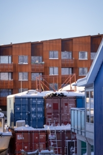 Benannt nach der Straße, in der er verortet ist, realisierte das Kopenhagener Büro Biosis den Wohnkomplex Nuukullak 10, der 45 Ein- bis Vierzimmerwohnungen sowie ein Café umfasst. Biosis ist spezialisiert auf die komplexen Anforderungen des Bauens in den extremen Klimaregionen Nordeuropas. Position und Gebäudeform trotzen den starken arktischen Nordwinden und zielen auf optimalen Tageslichteinfall während der langen, dunklen Wintermonate. Den planerischen Entscheidungen gingen intensive Studien zu Wind und Lichtsituation voraus, erklären Biosis.