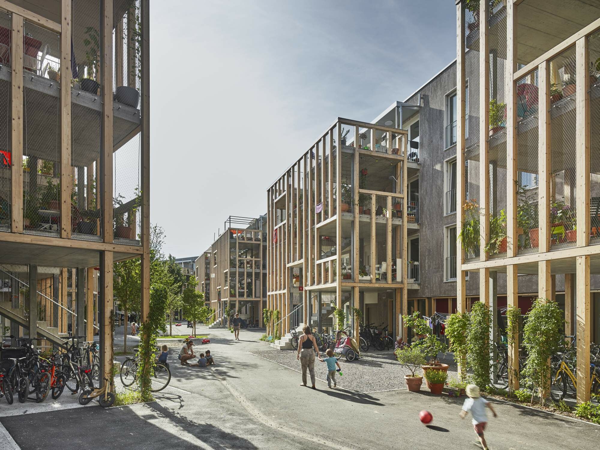 Die Planer*innen setzten bewusst auf eine möglichst repetitive Bauweise. Immer gleiche Fensteröffnungen und Raumgrößen sowie eine einfache Baukörperkubatur sollten Kosten sparen. Treppenaufgänge und private Balkone orientieren sich zur namensgebenden Gasse und sitzen in einer Holzkonstruktion dem einschaligen Mauerwerk vor. Dies soll einerseits den Austausch der Bewohner*innen fördern, dient aber auch dazu, das beheizte Gebäudevolumen möglichst gering zu halten.