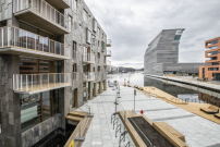 Die kompakten Baukörper mit den schrägen Dächern sind zwischen sechs und acht Geschossen hoch. Der Abstand zwischen den Häusern beträgt an mancher Stelle lediglich sechs Meter. Umso besser also, wenn das Fassadenmaterial Licht und Wasser reflektiert – man rufe sich nur einmal die kurzen Tage des skandinavischen Winters ins Gedächtnis. Um das Monolithische der Baukörper zu unterstreichen, wählten die Architekten ein Material, das sich zur Dachdeckung und als Fassadenverkleidung eignet. Zugleich sollte der Baustoff langlebig und in der skandinavischen Bautradition verwurzelt sein. Daher fiel die Entscheidung auf Oppdal-Schieferplatten, die in Norwegen produziert und wegen ihrer hohen Widerstandsfähigkeit häufig verwendet werden.