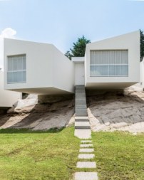 Mit einer kindlichen Unbeschwertheit hat Architekt Carlos Alejandro Ciravegna (Córdoba/Argentinien) diese fünf Wohnhäuser in einen argentinischen Felsen in der Region Córdoba gelegt. Die Topografie beachtend, hat er ihren Grundriss gebrochen. Alle Bauten schauen in die gleiche Flucht, aber nur ungefähr, denn das „Spiel mit dem Schatten und visuellen Überraschungen“, wie es der Architekt selber ausführt, äußert sich in leichten Unregelmäßigkeiten. In dieser Attitüde hat Ciravegna auch die großformatigen Fenster an die Fronten der Wohnhäuser gesetzt, immer gleich hoch, aber nicht immer gleich breit.