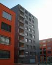 Die drei umliegenden kleineren Gebäude variieren typologisch den Bau A, kontrastieren diesen aber mit einer hellroten Putzfassade. Allen Gebäuden gemeinsam sind große Dachterrassen zur gemeinschaftlichen Nutzung.