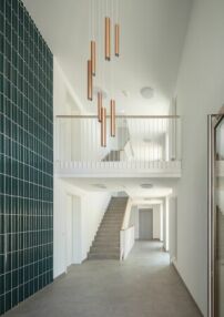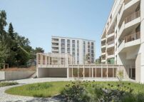 Auf ein Untergeschoss wurde verzichtet. Die erforderlichen Stellplätze, die nicht auf dem Grundstück untergebracht werden konnten, befinden sich in einem nahegelegenen, wenig ausgelasteten Parkhaus der städtischen Wohnungsbaugesellschaft. Die Bauwerkskosten des Projekts wurden mit gut 17,4 Millionen Euro angegeben, die Kostengruppe 500 mit rund 1,5 Millionen Euro. (iok)