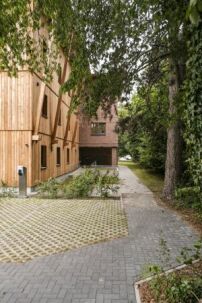 Das Haus liegt zentral, etwas nördlich des Paderborner Stadtkerns. Gröne Architektur übernahm mehr als nur den Entwurf: Die „Gröne Unternehmensfamilie“ betreibt ein eigenes Sägewerk und führt mit einem eigenen Handwerksbetrieb auch Maurer-, Zimmerer- und Tischlerarbeiten aus. Entstanden ist ein dreiteiliges Ensemble mit einem Backsteinbau in der Mitte, flankiert von zwei Holzbauten, die jeweils sechs Einzel-Wohnungen mit eigenen Balkonen aufnehmen. Im Erdgeschoss und im Massivbau befinden sich Gemeinschaftsräume. Für die persönliche Unterstützung der Mieter*innen gibt es außerdem ein Service-Büro vor Ort.