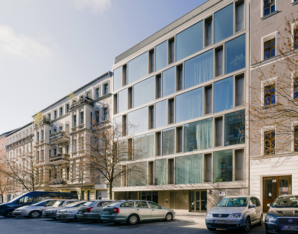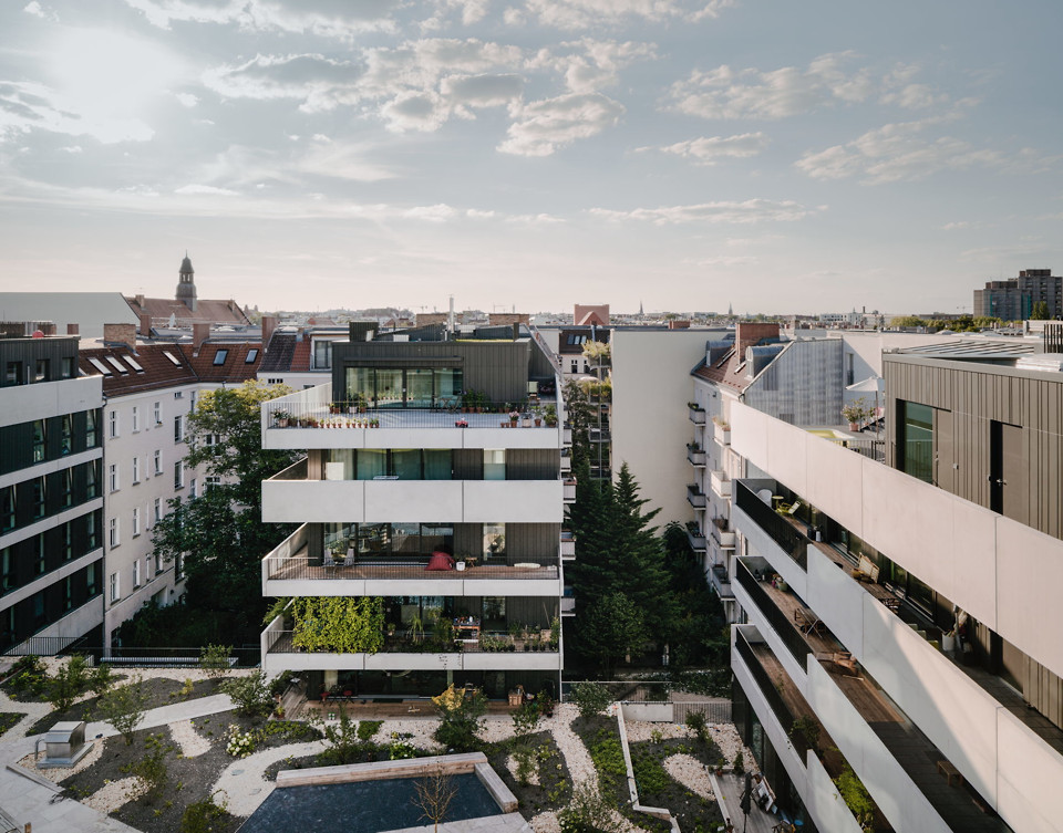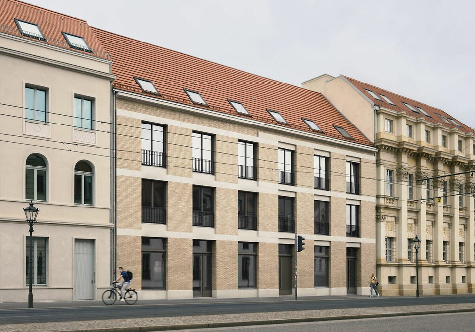 An der Erika-Wolf-Straße, die zwischen den beiden neuen alten Stadtblöcken verläuft, befindet sich auf einer Parzelle von nur 333 Quadratmetern ein kleineres Haus. Die Fassade wird von Betonfertigteilen im Sockel und entlang der Geschossdecken strukturiert. Einen Akzent in kräftigem Rot setzen die Fensterprofile und -geländer sowie das Hoftor. Hier gibt es sechs Wohnungen mit insgesamt 461 Quadratmetern Wohnfläche sowie eine Gewerbeeinheit mit 84 Quadratmetern.