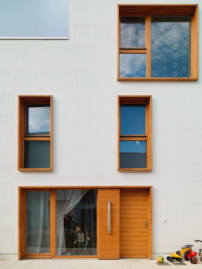 Das Spiel zwischen Stadt und Natur, öffentlichem und halböffentlichem Raum spiegelt sich auch in der Materialität der Fassaden wieder. Beide Projekte integrieren Elemente aus Holz als sichtbar werdendes Inneres. Der Bau in Alfortville präsentiert sich wie eine Festung zum Straßenraum – in klarem, glatten Beton mit regelmäßig angeordneten Kastenfenstern. Im Inneren, zum grünen Hof, versteckt sich eine behandelte Holzfassade, die durch Fensterläden in ständiger Bewegung scheint. Dagegen sind die Fassaden der Wohneinheiten in Charleville zurückhaltend, fast eintönig gestaltet. Sie wurden von Hand mineralisch beschichtet, im Detail zeigen sich die vertikalen Streifen des Auftrags. Die tief sitzenden Holzrahmen lockern die Strenge auf und geben den Bauten eine warme Qualität. (rc)