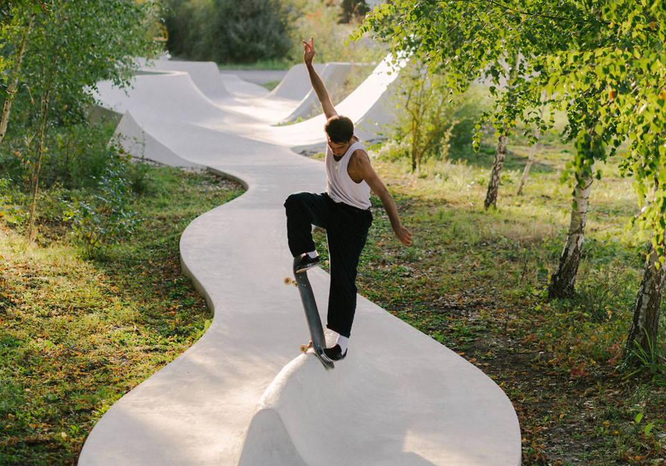 Interessante Beispiele organischer Formen findet man auch in der Landschaftsarchitektur – und das durchaus auch im steinern-urbanen Kontext, wie die Platzgestaltung von COBE in Kopenhagen oder die Anlage in Kaunas von 3deluxe beweisen. Geradezu ein Muss sind bewegte Formen bei anthroposophischen Auftraggeber*innen. Die Vermeidung rechter Winkel ist hier ideologisch begründet, während runde Formen bei Skateanlagen wie dem Projekt von MBL und David Apheceix schließlich pure Notwendigkeit sind. Größer könnten die Unterschiede eigentlich nicht sein. Die Beantwortung der eingangs gestellten Frage wird dadurch nicht leichter. (gh)