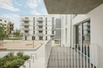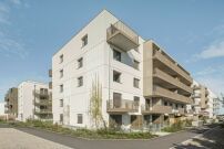 „Diese Qualität mit dem Dorfplatz, den Wegen, den Sichtachsen und den Bezügen zwischen den einzelnen Freiräumen war uns von Anfang an wichtig“, sagt Bettina Krauk von synn architekten. „Letztendlich ist genau diesem Maßstab zu verdanken, dass die große Anzahl an 324 Wohnungen optisch nicht wirklich ins Gewicht fällt.“ Während die Bauteile von synn mit warmen, bronzefarbenen Loggien und Balkonen bestückt wurden, in einem Mix aus Stabgeländern und Lochverblechungen, hat sich Trebersburg für einen deutlich kühleren Silberton entschieden. Im Erdgeschoss wurden die Fassaden an manchen Stellen mit Holzlatten und vertikalem Riffelputz verkleidet.