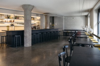 Im umgebauten Restaurant von Benno Mitschele wird Understatement geübt. Zurückhaltende Materialien wie anthrazitfarbener Terrazzo aus Lechkieseln und alte, grobkörnige Betonstützen legen das Augenmerk auf die servierten Speisen. - Rotes Haus in Illerbeuren von SoHo Architektur (Memmingen), Bauherr*innen: Julia und Michael Staudinger