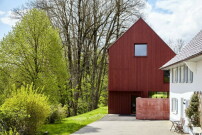Auffällig unscheinbar: Die knallrote Boden-Deckel-Verschalung aus Holz verschafft der archaischen Hausform Signalwirkung im dörflichen Kontext. Konstruktive wie sichtige Massivholzwände- und decken führen tradierte Bauweisen zeitgenössisch fort.